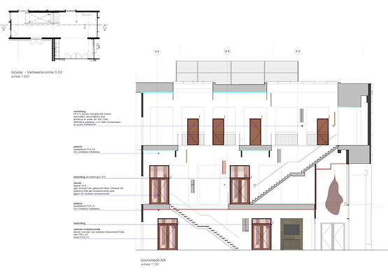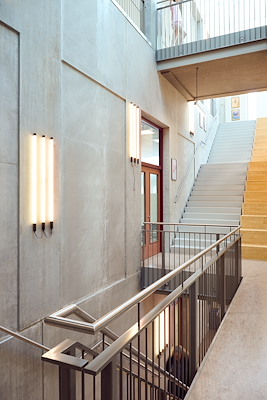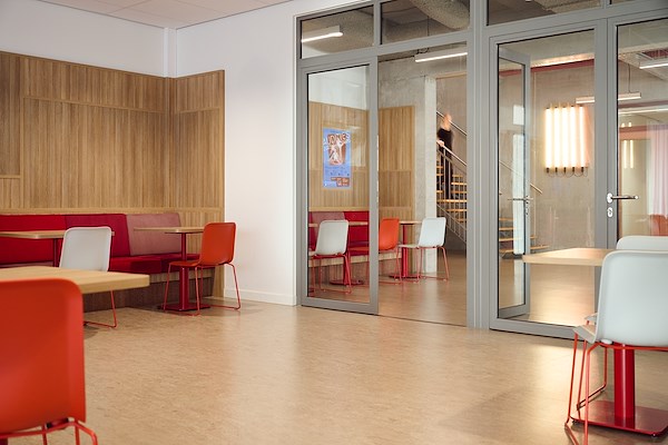 Het industriële licht op de betonnen wanden is een mooie hedendaagse toevoeging. Er is rekening gehouden met het ritme van de aangebrachte nissen in de bouwkundige betonnen wanden waardoor een mooi samenspel is ontstaan. Maatwerk zitelementen worden gedragen door een plint van bakstenen en zijn gemaakt van gerecycled bouwmateriaal, de wanden zijn gemaakt van akoestisch plaatmateriaal. Door deze manier van ontwerpen is siginificante budgetbesparing gerealiseerd, de bouwlaag is deels de interieurlaag geworden.