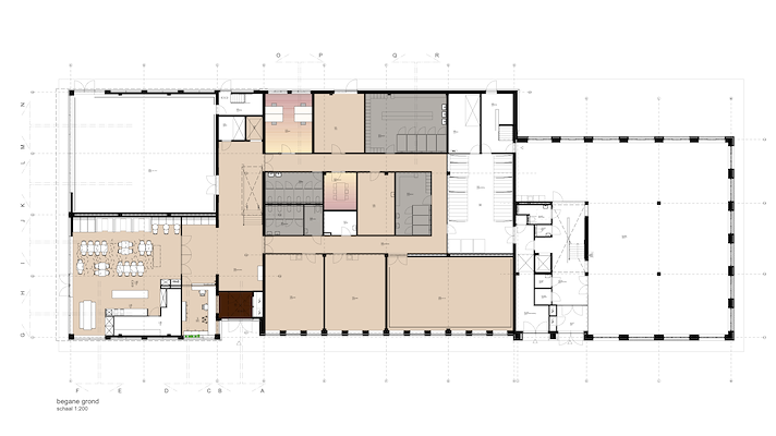 De warme laag is ook in de kantoren, oa op de vloeren met verloop van betongrijs naar bordeaux