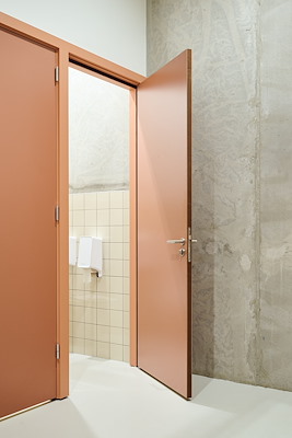 We voegden warmte toe aan het ruwe casco door middel van kleur en materiaal. Daarbij hebben we als uitgangspunt de klassieke kleur van het theater, bordeauxrood, gemengd met klassiek balletroze. De toepassing echter is een volledig andere dan men zou verwachten.