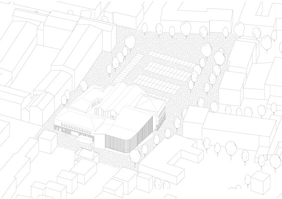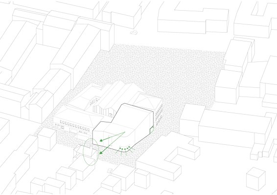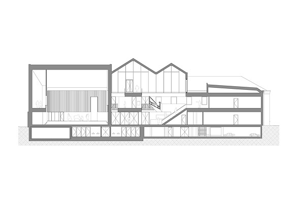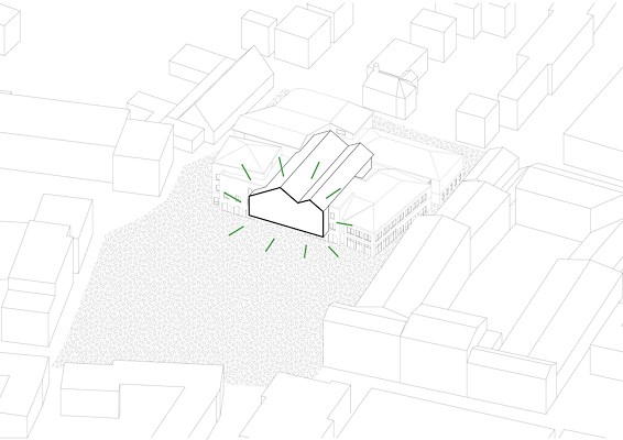 De ruimtelijke kwaliteit van het atrium is mede mogelijk gemaakt door het verplaatsen van programma naar het nieuwe volume aan de achterzijde van het gebouw. Onder de nieuwe multifunctionele zaal bevindt zich een kelder waarin aanvullende en ondersteunende functies zijn ondergebracht. Hierdoor is in het hart van het gebouw ruimte vrijgespeeld voor licht, lucht en ontmoeting.
