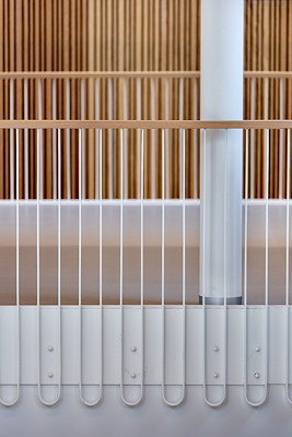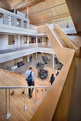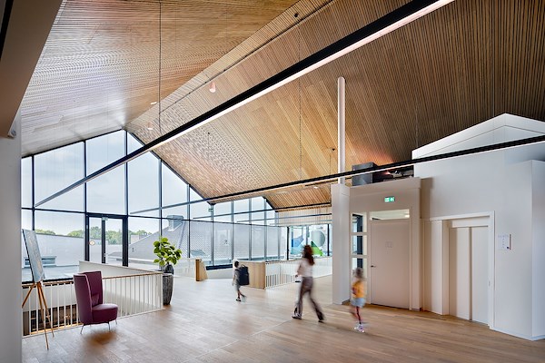 Centraal in het gebouw ligt het atrium dat alle functies – oud én nieuw - met elkaar verbindt. Het vormt een ruimtelijke spil waarin beweging, ontmoeting en verblijf vanzelfsprekend zijn. Ruimtelijke overgangen en royale houten trappen stimuleren spontane interactie tussen de vele gebruikers en nodigen uit om omhoog te gaan naar de bibliotheek of de panoramazaal. Dankzij slimme zichtlijnen en tussenruimtes ervaart iedere bezoeker een plek op maat: beschut en intiem, of juist open en publiek. Het gebouw biedt een framewerk waarin iedere vaste gebruiker zijn eigen plek ook echt als eigen kan maken – een thuis binnen een gedeeld huis.