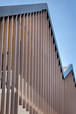 Aan de theaterzijde is veel aandacht besteed aan het voorkomen van een typische “achterkant”. Hoewel hier ook de loading docks en technische ruimten zijn ondergebracht, is deze zijde beslist niet gesloten. Grote ramen met slim toegepaste akoestische voorzieningen leggen een visuele relatie met de omgeving. Binnenkijkend zie je via een lang horizontaal raam het kerktorentje. Een hoekraam aan de straatzijde opent zich als een etalage – een kwart cirkel die de bocht om meeloopt. Hierin weerspiegelt zich het levendige binnenprogramma. Zoals een fotografische Muybridge-sequentie bieden de ramen zicht op dansers in beweging, steeds anders, raam na raam.