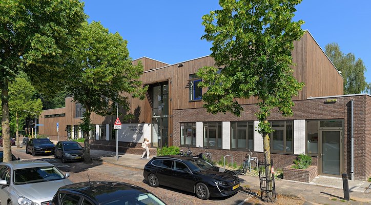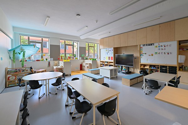 MFA Bloemrijk staat in de door Dudok ontworpen kleinschalige jaren ‘30 Bloemenbuurt in Hilversum. De Multi Functionele Accommodatie is verdeeld over twee bouwlagen en biedt, behalve aan de basisschool, ook onderdak aan een kinderdagverblijf, BSO, consultatiebureau, buurthuis en jongerencentrum.