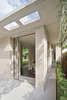 Belangrijk zijn de zichtlijnen, waardoor afzonderlijke ruimten ontstaan zoals een studie nis, een verlaagd zitgedeelte met brede vensterbanken en hangende openhaard, een transparante doorloop langs het zwembad, naar een logeer-, verblijfsruimte met sanitaire ruimte.
