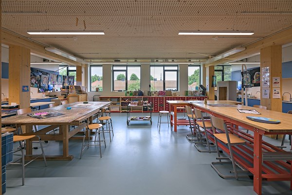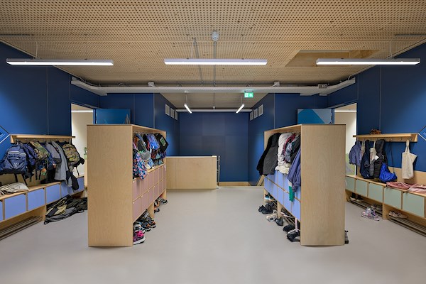 Op de begane grond biedt één open leerplein ruimte aan de onderbouw; op de verdieping vormen instructieruimtes, technieklokalen en kleinere leerplekken een gevarieerde leeromgeving met volop ruimte voor zelfstandigheid en samenwerking. Verrijdbare digiborden, elektrazuilen en modulaire meubels onderstrepen de mate van aanpasbaarheid.