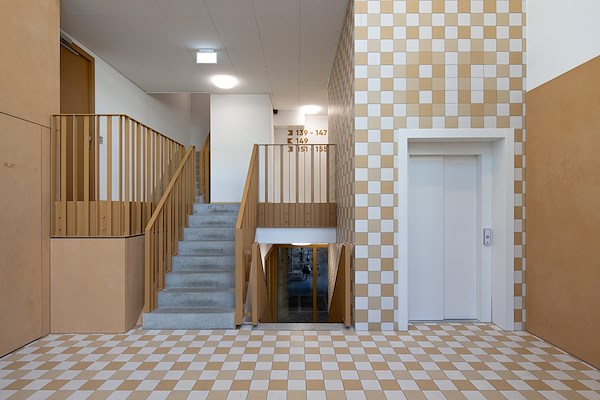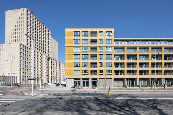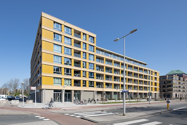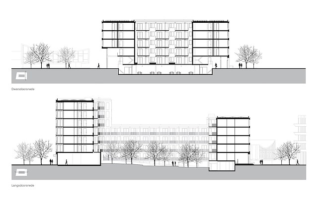 Eén van de uitdagingen was het inpassen van de prominente aula die uit het naastgelegen gebouw naar voren steekt. Het oude Calvijn College in Amsterdam Nieuw West is een ontwerp van Ben Ingwersen van eind jaren ’60. Voor de crisis van 2008 was de intentie nog om het te slopen en het plot langs de Schipluidenlaan uit verschillende bouwblokken op te bouwen. Maar met de tijd is het gebouw tot leven gekomen als creatieve broedplaats, met onder andere kunstcentrum De Appel, en wordt het nu gewaardeerd als prachtig voorbeeld van Nieuwe Zakelijkheid-architectuur. Een herwaardering van onze architectuurgeschiedenis en van haar rationele, optimistische houding. Wij hebben met een setback op de hoek ruimte geschapen voor een interessante entree naast de aula en een prettige doorgang naar het toekomstige parkje tussen de gebouwen.