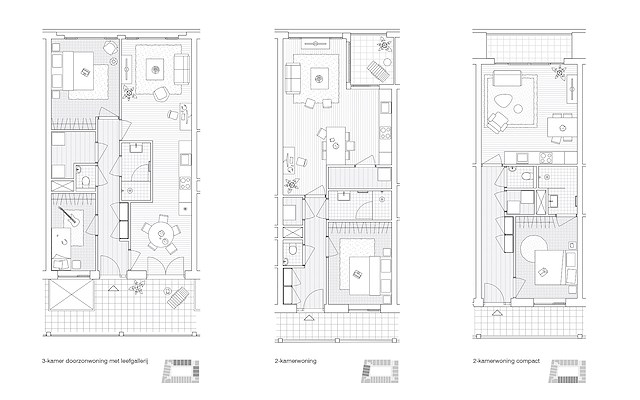 Podium is een open gebouw, dat voortbouwt op het AUP ideaal van licht, lucht en ruimte. Langs alle zijden wordt de verbinding met de buitenwereld gezocht. In doorzonwoningen aan de noord- en oostzijde kan aan twee kanten geleefd worden, met daglicht van voor naar achter. Langs de westzijde zorgen we met loggia’s voor verbinding tussen de woonkamer en het terras. Woonkamers op de begane grond liggen net verhoogd boven de straat, waarmee subtiel de overgang van privé naar publiek duidelijk wordt gemaakt. Deze overgangszone naar de straat wordt gemarkeerd door robuuste plantenbakken die voortkomen uit de gevel. Aan de straat is bovendien een kleine buurt-supermarkt in het plan opgenomen, waardoor er langs de gevel veel leven mogelijk is.