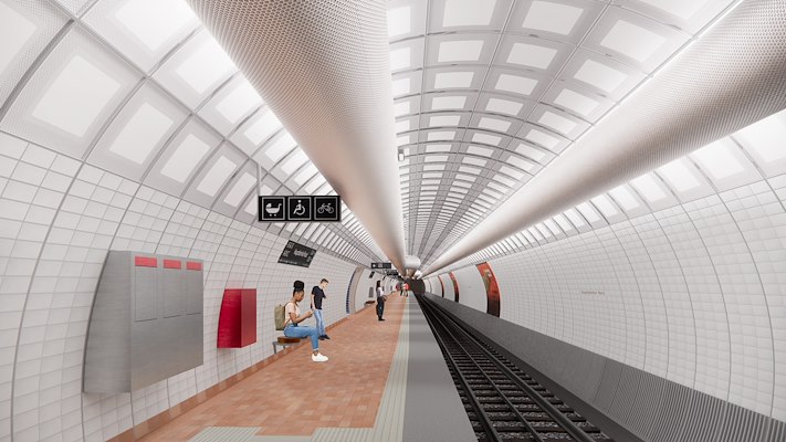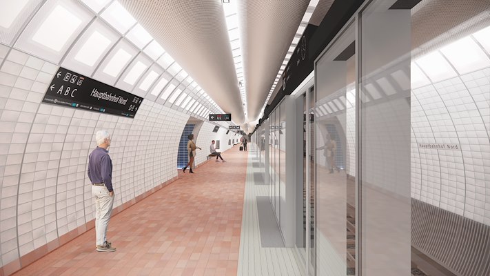 Hauptbahnhof Nord, geopend in 1968, vormt een belangrijk knooppunt in het metronetwerk van Hamburg. De karakteristieke cirkelvormige perrons, gebouwd volgens de typische boorschildmethode, weerspiegelen het technisch optimisme van de wederopbouwperiode. In het voorstel van GROUP A wordt deze architectonische erfenis met respect benaderd. De kenmerkende tunnelbuizen en modulaire tegelpatronen uit de jaren zestig worden in ere hersteld. Tegelijkertijd zorgen nieuwe, verfijnde materialen en ruimtelijke verlichting voor een eigentijdse interpretatie die de historische betekenis van het station versterkt. Met deze benadering wordt het erfgoed van het naoorlogse modernisme en het architectonisch drieluik met de stations Messehallen en Gänsemarkt gewaarborgd, maar ontstaat tegelijkertijd ruimte om hedendaagse functionaliteiten een plek te geven, zoals een rookafvoersysteem, extra ontsluitingsroutes en moderne bewegwijzering.