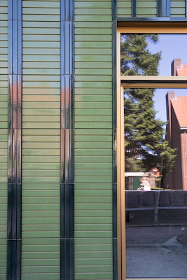 De stadswoningen aan de kop richting de Lijsterbesbuurt hebben gevels van groen keramiek. Met twee tinten groen maken we op de gevel het patroon van een barcode, die doorzet in het hekwerk rond de tuin. De barcode codeert voor ‘040 De Jonghlaan,’ een samentrekking van het Eindhovense netnummer en de straatnaam. Tegelijkertijd refereert de barcode aan de digitalisering van de meest kenmerkende Eindhovense industrie. Van lichtstad tot high-tech campus.
