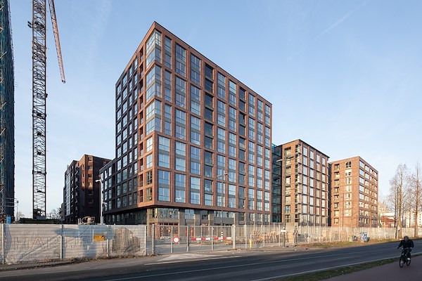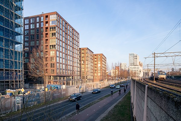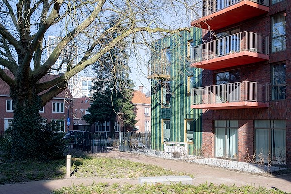 “We vinden het ontwerp van ons eigen woongebouw erg geslaagd, de groene stadswoningen zijn een leuke verbijzondering en zorgen voor herkenbaarheid. De algemene ruimtes zijn mooi en aangenaam afgewerkt, wat zorgt voor een beetje extra karakter en ruimte geeft voor ontmoeting. Hoewel het gebouw gelegen is nabij twee drukke wegen, zorgt de opzet met een gemeenschappelijk park aan de voorzijde voor een rustige en geborgen entree. Ook is het handig dat de toegangen van de fietsenstalling wél weer direct uitkomen op het fietspad achter het gebouw. Met ons appartement zijn we erg blij en we wonen er dan ook met veel plezier. Dankzij de grote raamopeningen van vloer tot plafond hebben we een erg lichte woning en kunnen we elke avond genieten van het uitzicht op de stad. Ook zijn we erg blij met de grote balkons, waar we graag tijdens warmere avonden buiten zitten."