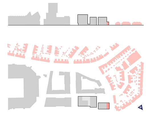 Het volume sluit aan op de middelhoge woongebouwen naast het stadion. De sterke stedelijke wand langs de straat schermt een geluidsluw binnengebied af. Met positionering en compartimentering van de drie losse gebouwdelen zorgen we voor rustige tuinen en overzichtelijke schaal. De bestaande in en uitrit van de stadion parkeergarage is het ensemble geïntegreerd. Op de kop staan bovendien vier bijzondere stadswoningen, de Benjamin, die de aansluiting met de aangrenzende kleinschalige Lijsterbesbuurt markeren.