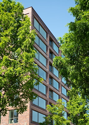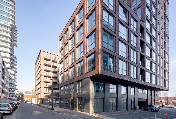 Langs de gevels hebben we met minimale ingrepen voor variatie en samenhang gezorgd. Maar ook voor rust. Daar vraagt deze drukke omgeving om. En dat doen we bijvoorbeeld met subtiel terugliggende vlakken in het metselwerk, horizontale betonnen banden in een deel van het plan en een regelmatige verdeling van de balkons.