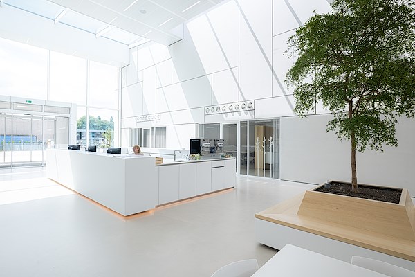 Tussen de volumes bevinden zich transparante zones, zones die ontmoeting en samenkomst stimuleren. Een van deze zones is het royale centrale atrium van 45 bij 12 meter met een hoogte van 7 meter. Dit atrium vormt de centrale as van het kantoor en vormt met de toevoeging van echte bomen een verlengde van de abstracte her-aangelegde tuin.