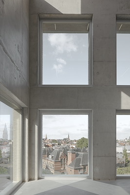 De samenhangende opzet bevordert beweging tussen de ruimtes, wat de toegankelijkheid en interactie door het hele gebouw vergroot. De positionering van de volumes volgt uit de belangrijkste zichtlijnen en de gewenste ruimtelijke kwaliteiten van het complex. De horizontale foyer zelf wordt omlijst door een transparante gevel met uitzicht op het openbare plein, de hoofdingang en diverse groene patio's. De patio's markeren de overgang naar omliggende bestaande gebouwen op verschillende niveaus en brengen licht naar de onderste verdiepingen. De horizontale foyer biedt steeds zicht op de buitenruimtes en de andere gebouwen, waardoor gebruikers de structuur van het complex intuïtief begrijpen. De horizontale foyer is georganiseerd binnen en rond bakstenen volumes - de "seminarzalen" - met een foodcourt, auditorium, collegezalen, projectruimtes, vergaderzalen en een onafhankelijke commerciële ruimte. De verticale foyer verbindt de “seminarzalen” met de “leertoren”, waarin klaslokalen, computerruimtes en een skillslab zijn ondergebracht. Een brede en comfortabele trap, integraal gecombineerd met studieruimtes, fungeert als een voortzetting van de openbare ruimte langs elke verdieping. Om het gebruik van de trap te stimuleren en bij te dragen aan gezond ouder worden, stoppen de liften alleen op de oneven verdiepingen, waardoor gebruikers mogelijk één verdieping omhoog of omlaag moeten lopen. De grote, diepe ramen kenmerken de bakstenen gevel van de toren en bieden een spel van openingen met diverse, genereuze uitzichten over het stadscentrum. Tot slot versterkt het aangename en toegankelijke groene dakterras van het gebouw het groene hart van de campus.