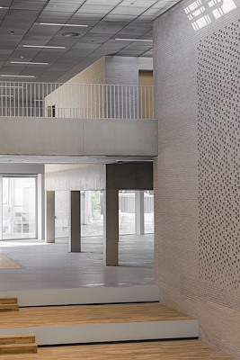 De binnendeuren en raamkozijnen zijn gemaakt van massief eiken, en de vloeren en muren van de foyer zijn van beton. Bakstenen wanden gecombineerd met glad maar tactiel zichtbeton definiëren de ruimte en geven het een robuuste stedelijke uitstraling, terwijl het toch een vriendelijke binnenruimte blijft. Met het hoge plafond en bijbehorende dakconstructie, half zichtbaar door het strekmetaal, wordt de horizontale foyer verlicht door subtiel daglicht dat door de daklichten en de gevelopeningen naar binnen komt. In contrast met de foyers zijn de onderwijsruimten bekleed met hout, wat een lichte en natuurlijke sfeer biedt.