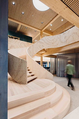 Een voorbeeld hiervan is de opvallende houten trap, voorzien van een patroon dat doet denken aan bruisend water. Ook de raamfolies dragen dit thema, met grafische verwijzingen naar de elementen die in het laboratorium worden onderzocht.