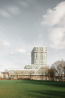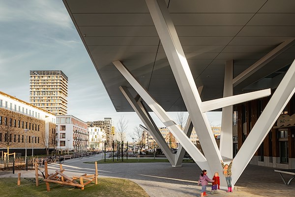 De alles-in-één-school is een welkome ontwikkeling in Sloterdijk Centrum. Hij biedt plek voor de kinderen uit de buurt en is prachtig gelegen naast Sportpark Spieringhorn. De school is vernieuwend in zijn opzet met een grote verscheidenheid aan verschillende leerruimtes, van heel groot voor groeps-doorbroken onderwijs tot intieme zelfstandige werkruimtes voor kleine groepjes leerlingen. De school is ontworpen om de ontwikkeling van kinderen van 0-13 jaar, als een doorgaande lijn, zo vanzelfsprekend mogelijk te maken. De kinderopvang en de school van in totaal 23 groepen voor ca. 450 leerlingen zijn daarom ruimtelijk als één geheel vormgegeven, zonder een harde scheiding tussen het kinderopvang-en basisschoolgedeelte. Geborgen en uitdagend; om te spelen, te leren, te groeien en te ontdekken.