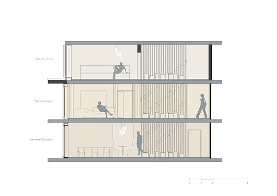 Ook in Floating Gardens maakt de deeleconomie zijn entree. In het hart van het gebouw, direct gelegen aan een groene patio, ligt de huiskamer, die over drie verdiepingen is opgespannen en fungeert als een informeel ontmoetingspunt voor de bewoners. Hier kunnen ze de krant lezen, op hun laptop werken, samen lunchen, borrelen met medebewoners of ’s avonds eten met vrienden. De huiskamer creëert een gevoel van gemeenschapszin in het gebouw en zorgt ervoor dat de mentale leefruimte van bewoners groter is dan die van hun eigen appartement. Ook is een logeerkamer in het gebouw voorzien, waardoor je vrienden of je (groot)ouders prima een nachtje kunnen blijven slapen, ook als je zelf een compact studioappartement huurt. Door de verbinding met de gemeenschappelijk daktuin op de 5e verdieping – met uitzicht over Spieringhornpark en Sloterdijk - en de rustig gelegen patio op de 2e verdieping is er ook buiten voldoende plek voor ontmoeting tussen bewoners.