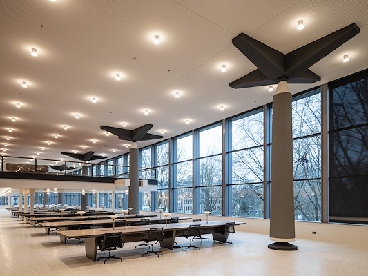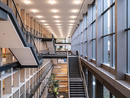 In het semipublieke deel is een vijflaags atrium met trappen toegevoegd om lopen te stimuleren en elkaar te ontmoeten. Het atrium biedt zicht op de stadstuin en leidt naar het restaurant, dat de Singelgracht overziet. De kade is een publieke ontmoetingsplek met een houten steiger die net boven het water zweeft. De dubbelhoge kashal is getransformeerd tot een vergadercentrum met breakout-zones en een monumentale leeszaal, 120m lang, die te gebruiken is als werkplek, maar ook voor congressen en diners. In het midden staat de cilindrische trap ontworpen door Duintjer. Mecanoo voegde er eenzelfde trap aan toe die de tweede met de derde verdieping verbindt.