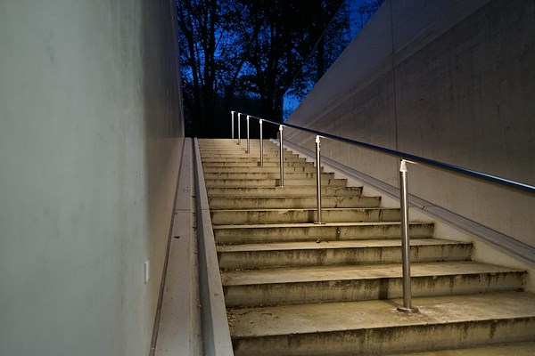 De verlichte trapleuningen begeleiden gebruikers op een veilige en comfortabele manier naar de ondergrondse fietsenstalling – een klein, maar essentieel detail in het grotere geheel van een functioneel stadspark.