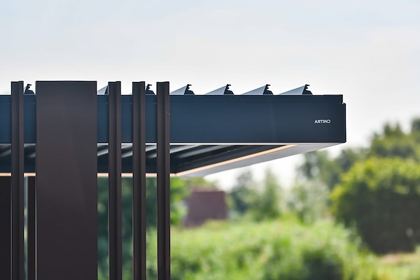 De overkapping is uitgerust met verstelbare aluminium lamellen, die eenvoudig met een afstandsbediening kunnen worden gekanteld. Zo bepaal je zelf de hoeveelheid zonlicht en ventilatie op elk moment van de dag. Bij een plotselinge regenbui sluiten de lamellen automatisch, waardoor de ruimte droog en comfortabel blijft.