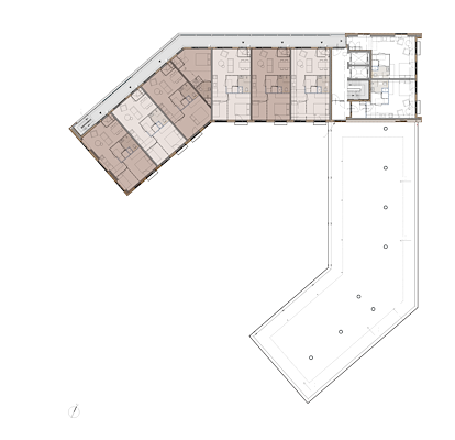 Het U-vormige gebouw aan een semi-open binnenhof ontwikkelt zich van drie lagen aan de straatzijde naar vijf lagen aan de waterzijde, waar het met de voeten in het water staat.