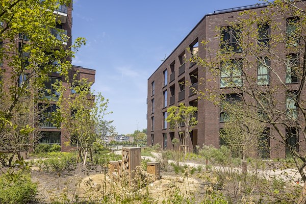 . Hierin komt de ambitie voor klimaatadaptatie, inheemse beplanting, biodiversiteit en bewatering van het groen samen om een aangename binnentuin te realiseren die ook echt bijdraagt aan de omgeving. De retentiekratten onder de tuin zorgen voor de duurzame bevochtiging van de planten en voorkomen overbelasting van het rioleringsstelsel. De hogere daken voeden deze retentiekratten met regenwater. Zo zijn de klimaat adaptieve maatregelen direct ingezet voor zicht- en voelbare kwaliteiten van het ontwerp.