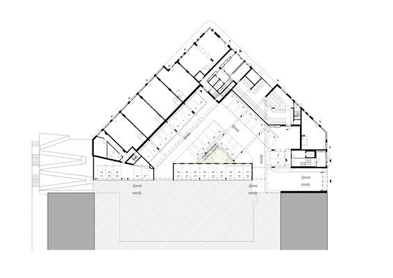 We hebben als eerste in het blok ruimte bespaard om een groene landing voor de bestaande loopbrug over de Zuidstedeweg te kunnen maken. Zo is er ruimte voor meer groen aan het stenige busstation. In het bouwblok hebben we verder openingen gemaakt, zodat de groene binnentuin zichtbaar wordt vanuit het openbaar gebied, onderdeel wordt van het ecosysteem van City en het daglicht door het blok valt. Dit hebben we versterkt door het groen over een omlopende luifel door te trekken naar de buitenzijde van het blok. Zo wordt het blok een gelaagd ensemble, waar alle gevels mee doen. Ons deel aan het stationsplein voorziet in 99 appartementen en een plint met zakelijke dienstverlening. Aan de binnenzijde zit een compacte overdekte parkeergarage voor het hele complex.