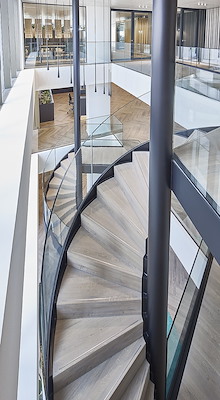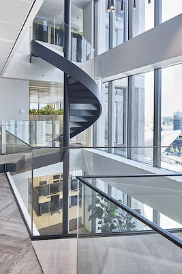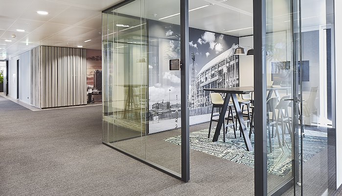 De openheid van het ontwerp vraagt om transparante verbindingen zonder concessies te doen aan privacy of akoestisch comfort. QbiQ realiseerde dit met haar iQ PRO Glass wandsystemen: slanke aluminium profielen in combinatie met dubbele beglazing zorgen voor maximale transparantie en optimale geluidsisolatie. Daarnaast zijn in diverse zones volglazen deuren toegepast, met geïntegreerde folieprints die verwijzen naar iconische Rotterdamse stadsgezichten.