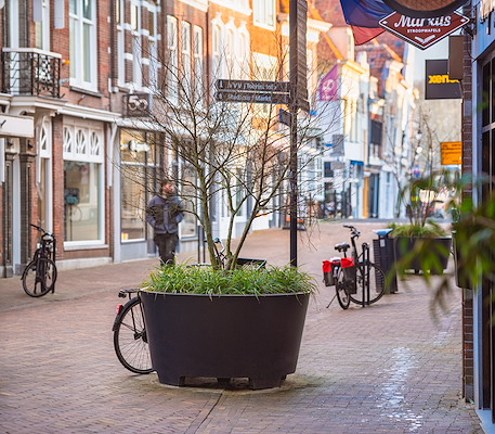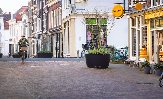 In de binnenstad van Gouda zijn tien ronde, verplaatsbare plantenbakken geplaatst als onderdeel van het Kwaliteitsplan Openbare Ruimte. Deze bakken zijn waterdicht, uitgerust met sensoren die het vochtgehalte meten, en eenvoudig te verplaatsen bij evenementen. De beplanting is duurzaam en aantrekkelijk voor bijen, en sluit aan bij het karakter van de stad. Gouda zet hiermee een stap richting een groenere, klimaatbestendige leefomgeving.