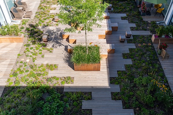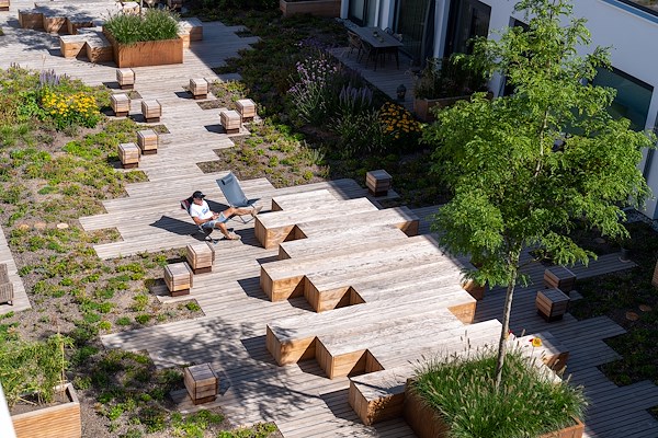 Architect Pascal Grosfeld tekende voor het transformatieontwerp, waardoor de nieuwe appartementen binnen de kaders gerealiseerd konden worden. De daktuin aan de binnenzijde van het complex is voorzien van verschillende elementen geleverd en geproduceerd door FURNS in samenwerking met AWOOD. FURNS heeft hier verschillende cortenstalen elementen mogen leveren zoals plantenbakken, zitpoefen bekleed met hardhout. De vlonders van AWOOD sluiten nauw aan bij het ontwerp en uitvoering van de geleverde producten. Idverde heeft de opdracht aan FURNS verstrekt en de uitvoering gerealiseerd voor haar opdrachtgever Rooftop Dakbeheer B.V.
