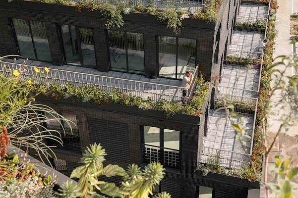 Kavel O Track 8 in Sloterdijk, ontworpen door De Zwarte Hond, maakt deel uit van het MO*town project. Dit duurzame en groene gebouw biedt 82 woningen en diverse openbare voorzieningen op de begane grond. Het gebouw heeft een opvallende, trapsgewijze, glanzend donkere gevel en bestaat uit drie verbonden volumes met galerijen en loopbruggen. Deze opzet bevordert sociale interactie en ontmoeting, van de straat tot aan de bovenste verdieping.