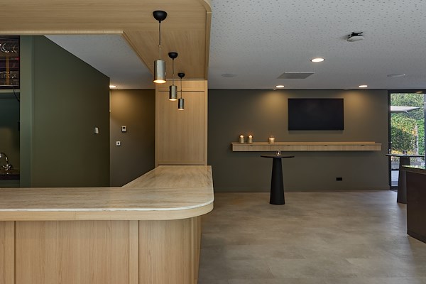 Het hart van ‘t Paviljoen – waar de bar, keuken en toiletten en zijn ondergebracht – is volledig geïntegreerd in een wandvullende afwerking van eikenhout. Dit zorgt voor balans en eenheid in de ruimte. Het interieurontwerp is zorgvuldig afgestemd op de functie van de locatie: ingetogen, huiselijk en licht.
