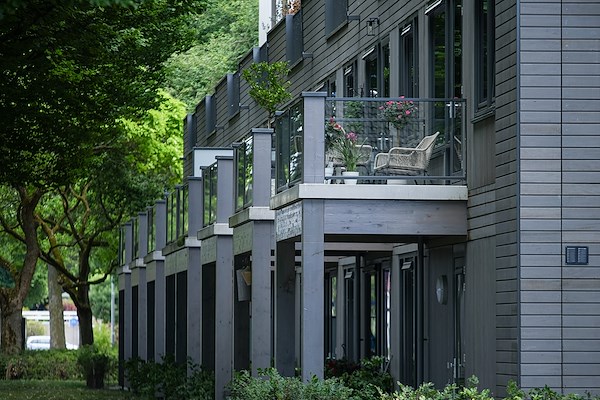 Voor het installatietechnisch ontwerp is gekozen voor prefab badkamers waarin leidingen en afvoeren zijn geïntegreerd. Door keuken, toilet en techniek in de plattegrond slim aan deze eenheid te koppelen, bleef het houten casco onaangetast. De woningen worden ontsloten via een corridor op de onderste lagen en via galerijen op de verdiepingen. De verbrede plint fungeert daarbij als basis voor terrassen, bordessen en balkons.