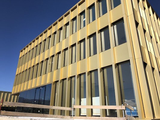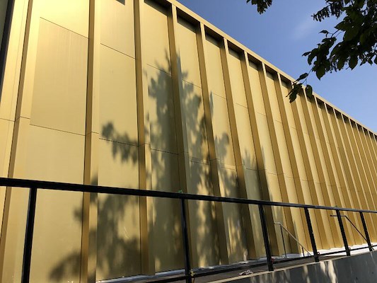 De architect maakte van drie losse gebouwen een eenheid door verticale, geanodiseerde en gekleurde aluminium profielen toe te passen. De gebruikte kleur op de profielen is Sandalor Goud. Door deze bijzondere kleur ontstaat een uniek, steeds wisselend lichtspel, passend in de parkachtige omgeving. De verticale profielen geven een mooi regelmatig ritme aan de gebouwen. Tussen de profielen zijn massief aluminium of glazen panelen geplaatst.