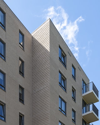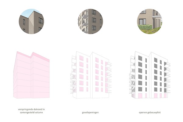 De inwendige hoeken van het gebouw worden benadrukt door geribbeld metselwerk. Samen met de naar de hoeken geschoven balkons en het per gevel in verschillende hoogtes optrekken van de dakrand is er zo een gebouwvorm uit samengestelde volumes ontstaan. Geen enkele zijde van het gebouw is zo hetzelfde.