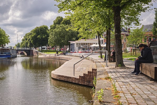 Het Dudokstation is inmiddels getransformeerd tot een groene verblijfsplek aan de Diepenring, waar je met de voeten in het water kan zitten. De plek vormt een belangrijke nieuwe schakel tussen het Ebbingekwartier en de binnenstad, en is in korte tijd een geliefde plek in de stad geworden.