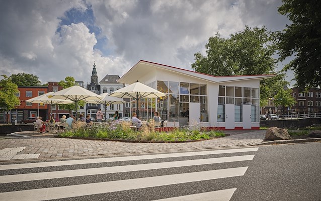 Voor het terrein en de vlonder werd gekozen voor een ambachtelijke detaillering in gebakken klinkers, natuursteen en echt hout. De kiosk is gerestaureerd met behoud van zoveel mogelijk origineel materiaal, waarbij de sporen van zeventig jaar in het interieur zichtbaar zijn gehouden.
