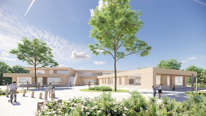 Nabij het centrum van Enter, op de voormalige voetbalvelden van Enter Vooruit, verrijst een nieuw Kindcentrum waarin twee basisscholen, kinderopvanglocaties en een bibliotheek samenkomen. Het ontwerp bestaat uit drie bouwdelen rond een open, licht hart: “De Middenstip”. Deze centrale ruimte is het kloppend hart van het gebouw en biedt plaats aan ontmoeting, een koffiehoek, optredens en de bibliotheek. De opbouw is kleinschalig, speels en warm door het gebruik van hout en past in schaal en uitstraling bij het dorpse karakter van Enter.