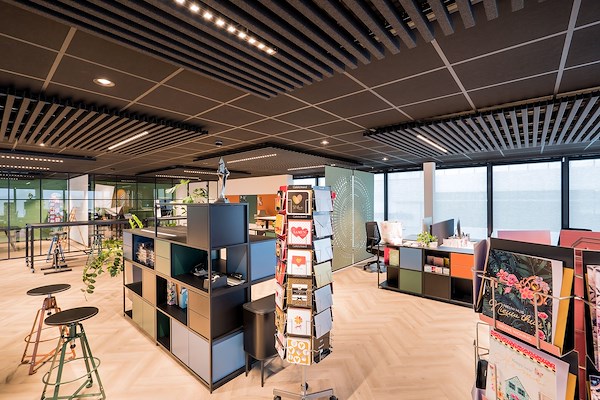 Blikvanger in de ontmoetingsruimtes is de Ecophon Soloâ„¢ Square. Deze volledig recyclebare plafondoplossing biedt een ruim scala aan ontwerpmogelijkheden. Zo kunnen ze strak in een raster worden gemonteerd of speels in verschillende lagen. De akoestische eigenschappen van de 40mm dikke panelen zorgen ervoor dat er een optimale akoestiek in de ruimte is.