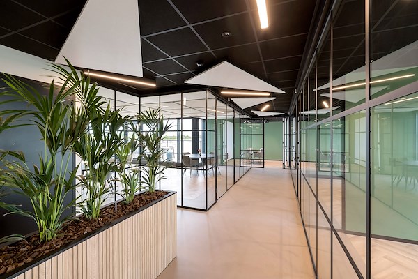 Met het gebruik van harde materialen zoals glaswanden en gietvloeren, is het belangrijk om goed na te denken over akoestiek. Onder het zwarte akoestische systeemplafond zijn diverse plafondsystemen toegepast voor een optimale akoestiek op de werkvloer. De speelse driehoeken in de gangpaden worden afgewisseld met HeartFelt vilten lamellenplafond in de kantoren.