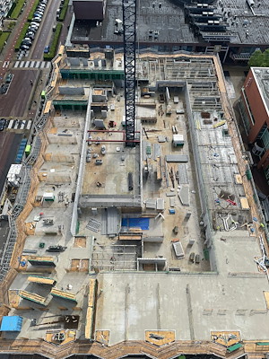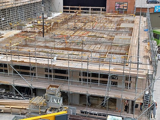 De bouw van The Orchard is in mei 2023 gestart. Net na de bouwvak zijn de laatste breedplaatvloeren geleverd, waarna de ruwbouw in september is opgeleverd. “In totaal zijn zo’n vierduizend breedplaatvloeren verwerkt”, weet Molenaar. “Al deze vloeren zijn uniek in samenstelling en apart door ons uitgeëngineerd. Bijvoorbeeld doorvoeringen hebben namelijk directe consequenties voor de stabiliteit van de vloer, die met extra wapeningsstaal moet worden opgevangen.” De breedplaatvloeren zijn in batches van 160 m2 en op een platte kar naar Rijswijk vervoerd, waar zij volgens een specifieke legvolgorde zijn gelegd. Dall: “Dankzij de afgeschuinde langskant kunnen de vloeren maar op één manier gelegd worden.”