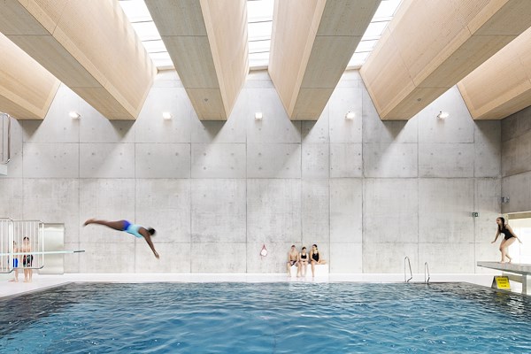De architecten wilden de kracht van verticaal daglicht maximaal benutten. Boven de twee hoofdzwembaden zorgen