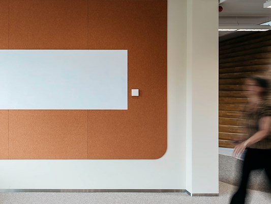 Alliander transformeerde hoofdkantoor Bellevue in Arnhem tot een toekomstbestendig en circulair gebouw (23.000 m², 95% materiaalhergebruik, grotendeels energieneutraal). Het interieurconcept is ontwikkeld door Coare Architectuur in samenwerking met duurzaamheidsspecialisten. Iwaarden realiseerde de glasdecoraties in zandstraalfolie, akoestische wanden in PET-vilt, wanddecoraties in akoestisch wolvilt en maatwerk whiteboards. Deze elementen verbeteren akoestiek en privacy, versterken de merkidentiteit en dragen bij aan een open, lichte en flexibele werkomgeving. Het project laat zien hoe esthetiek, functionaliteit en circulariteit elkaar kunnen versterken.