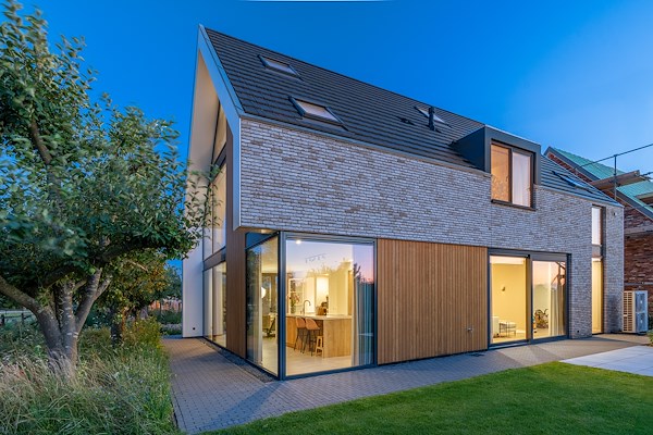 De bakstenen gevel en dak van deze woning vormen als het ware samen een omhullende schil, waarin speelse openingen van hout en glas een levendige uitstraling creëren, voornamelijk in de avond geeft dit een bijzonder fraai beeld.
