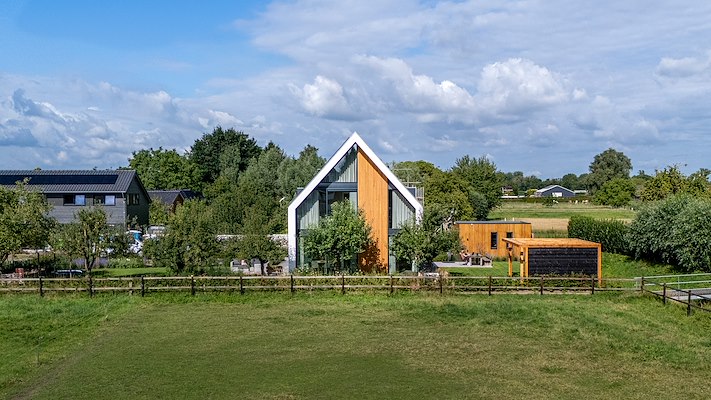 En die appelbomen? Er is bewust gekozen om deze niet te kappen, maar om juist een rol te geven in het ontwerp! Ze geven beschutting, maar laten je ook vanuit binnen genieten van het uitzicht.