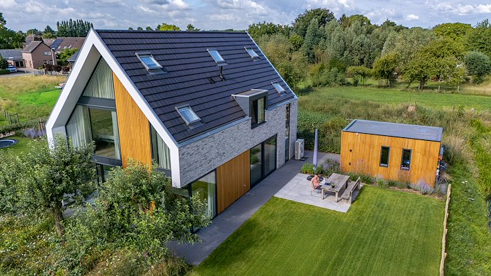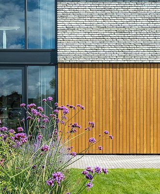 Het hout in combinatie met de moderne steen zorgen samen voor een warm, tijdloos contrast. Hoekramen trekken het landschap naar binnen en geven vanuit elke plek in huis een ander zicht op de omgeving.