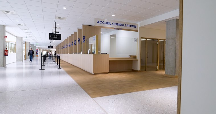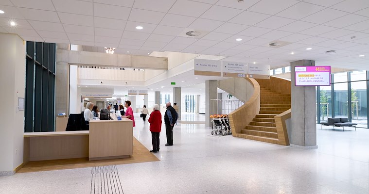 In de ontvangstruimte, wachtkamers, therapieruimten en gangen van het Grand Hôpital de Charleroi is OWA Sinfonia Premium toegepast. Deze plafondpanelen bieden naast een strak uiterlijk ook uitstekende akoestische eigenschappen in de verschillende ruimten.