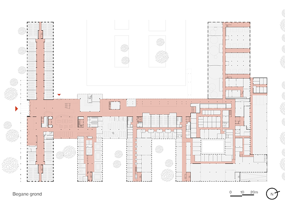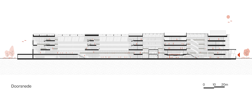 De nieuwbouw heeft een heldere kamvormige hoofdstructuur. Een centrale as fungeert als ruggengraat en verbindt de verschillende gebouwvleugels met elkaar. Deze opzet met bouwdelen en hoven maakt het mogelijk dat eenieder aan de gevel werkzaam is, met daglicht en uitzicht op de omgeving.