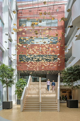 De centrale as is met zijn gebouwhoge atria het dynamische en inspirerende hart van de faculteit. Het biedt ruimte aan evenementen en de gebruikers vinden er eenvoudig hun weg. Hier worden de verschillende deelgebieden van de faculteit verbonden tot één geheel en is er volop ruimte voor ontmoeting.